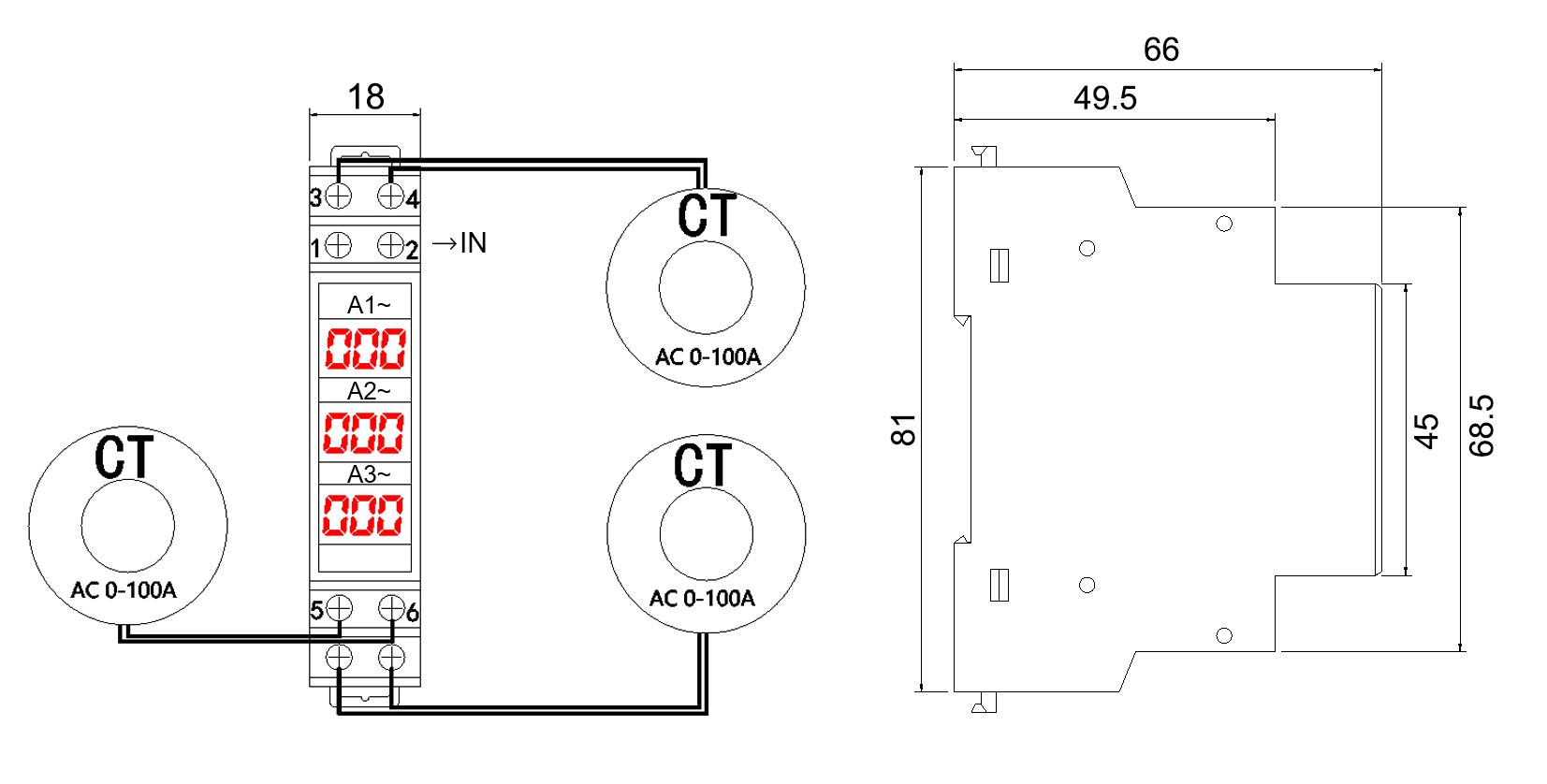 The KA-3P is a three-phase DIN-rail current display meter. It monitors AC current from 0-100A with ±2% accuracy, featuring a clear red display for reliable performance in industrial electrical panels.