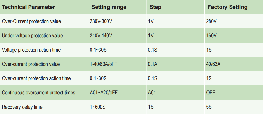 • Overcurrent protection: Supports adjustable protection values of 0.5-63A, with continuous overcurrent protection times set (1-20 times/OFF).